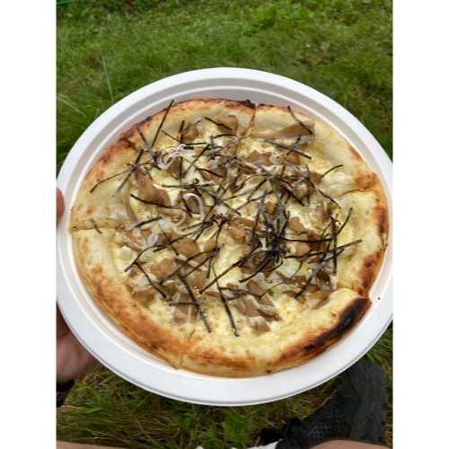 フジロックではアースガーデンさんに長~くお世話になっております。新潟県産の舞茸を甘辛く照り焼きにして、たっぷりチーズとガーリックマヨネーズで焼いた当店一番人気のピザです。是非ご賞味ください!