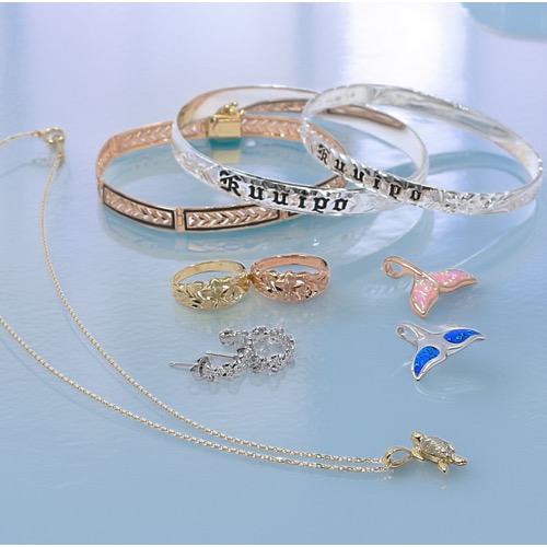 ハワジュでは、14K・シルバー・サージカルステンレスなど多彩な素材を用いた本格ハワイアンジュエリーを豊富にご用意。ペンダントやピアス、リング、ブレスレットなど幅広く取り揃えています。伝統的な彫り込みやラリマー・オパール等をあしらった特別な輝きのアイテムは、贈り物にも日常使いにもおすすめです。