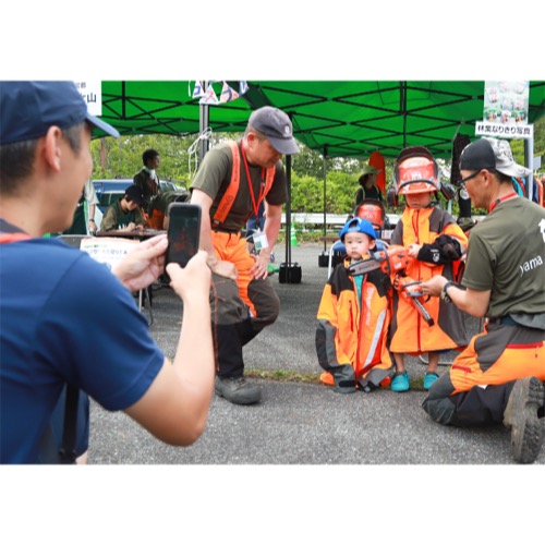 有限会社天女山は、林業の現場を伝えるパネル展示や木の輪切りクイズ、林業装備の試着体験を行います。森を学び、木にふれる楽しさをぜひ体感してください!