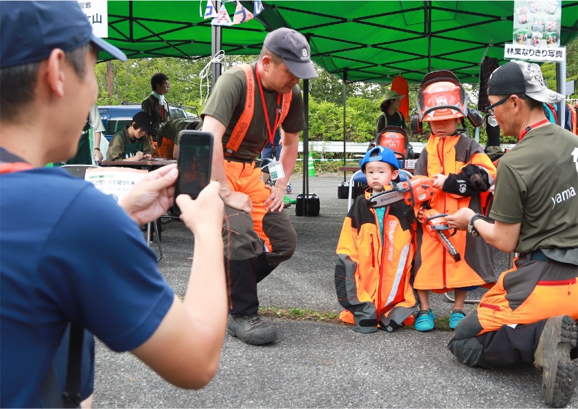 林業の活動を紹介するパネル展示に加え、木の輪切りに触れて種類を当てるゲームや、林業の装備や防護服を実際に身につけられる体験もご用意。「森で学び 森を未来へつなぐ」「木で遊び 木を知る」を通じて、林業の魅力や木の個性にふれていただけます